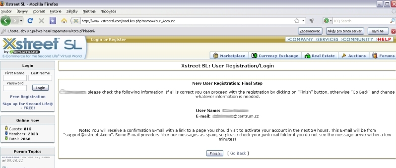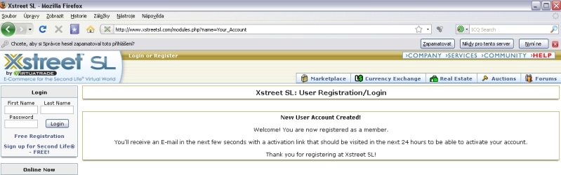 • Na stránce, kterou uvidíte po „aktivaci“ se dovíte, že účet byl aktivován a můžete přihlásit pod vaším SL jménem a pro XStreet SL zadaným heslem cestou tam uvedeného odkazu „this link“