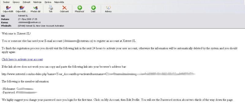 • Otevřete svoji poštu a v přijatém mailu klikněte na odkaz "Click here to activate yout account". Mail si ale schovejte třeba na horší časy. Máte v něm uvedeny vaše přihlašovací údaje.