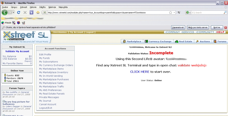 • Ještě ale není konec - pro úplné dokončení registrace a propojení účtů je potřeba se přihlásit do prostředí onoho světa, tam najít terminál (nejjednodušší bude asi zajít k radnici na náměstí v Bohemii – tam, v podloubí, vlevo od vchodu jeden takový právě stojí. Přijdete k němu a ve veřejném chatu napíšete text, který se vám zobrazil na stránce z odkazu „this link“ (bude to slovo validate a nějaká změť písmen). Na obrazovce uvidíte asi následující...